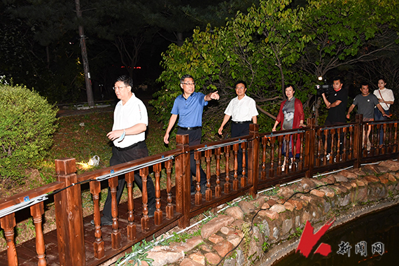 当晚7时许,校领导一行5人步行从图书馆出发,先后来到西篮球场、工业文明园区、似水流园人工湖、博雅广场等处,仔细查看沿途重点部位的亮化设施布置情况,副校长王锡钢,后勤与基建管理处负责同志就亮化工程改造方案、建设进度、施工细节等情况分别进行了介绍。