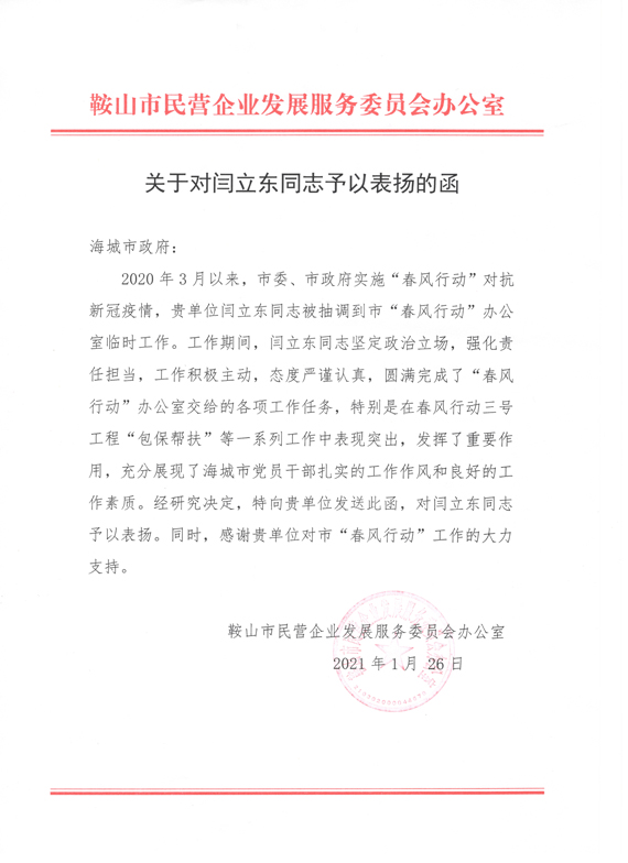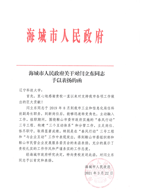 2021年1月,鞍山市民营企业发展服务委员会办公室向海城市政府送发了《关于对闫立东同志予以表扬的函》;2021年3月,海城市人民城府向米兰送发了《海城市人民政府关于对闫立东同志予以表扬的函》,对闫立东同志坚定政治立场、强化责任担当,积极主动完成鞍山市的各项重点工作任务予以表扬;对科大教职工在各项工作中表现出的扎实工作作风和严谨务实的工作态度予以肯定。校党委对闫立东同志能够站在学校与地方共谋振兴发展大局的高度,敢于担当,勇于奉献,积极作为,取得了较好的工作成绩表示肯定,并号召广大选派干部向闫立东同志学习,提高站位、增强意识、珍惜机会、主动作为,在推动辽宁全面振兴、全方位振兴的广阔天地里锻炼成长。
