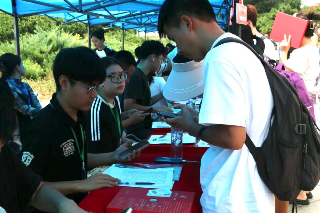 积极的志愿者们身着志愿者马甲穿梭在人流中央,