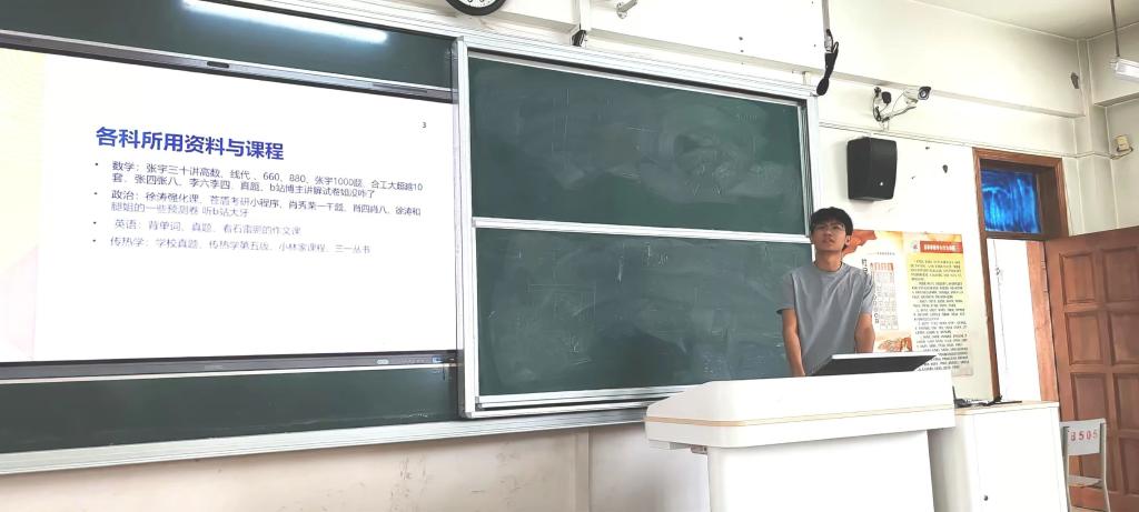 分享会上,学生代表能源2021-2班高阔阔(考取大连海事大学)、能源2021-4班刘卓(考取中国矿业大学)、能源2021-3班刘承康(考取东北大学)、能源2021-2王沂(考取昆明理工大学),材料2021-2班武梓颖(考取西北工业大学)、材料2021-2班张晨(考取北京科技大学)、材料2021-4班王利强(考取武汉理工大学)、材料2021-1班芦家慧(考取沈阳工业大学)从不同角度分享经验,他们分别围绕院校专业选择、复习计划制定、公共课与专业课备考技巧、心态调整、院校调剂技巧等方面展开分享,结合自身经历,毫无保留地传授避坑指南与高效学习方法。