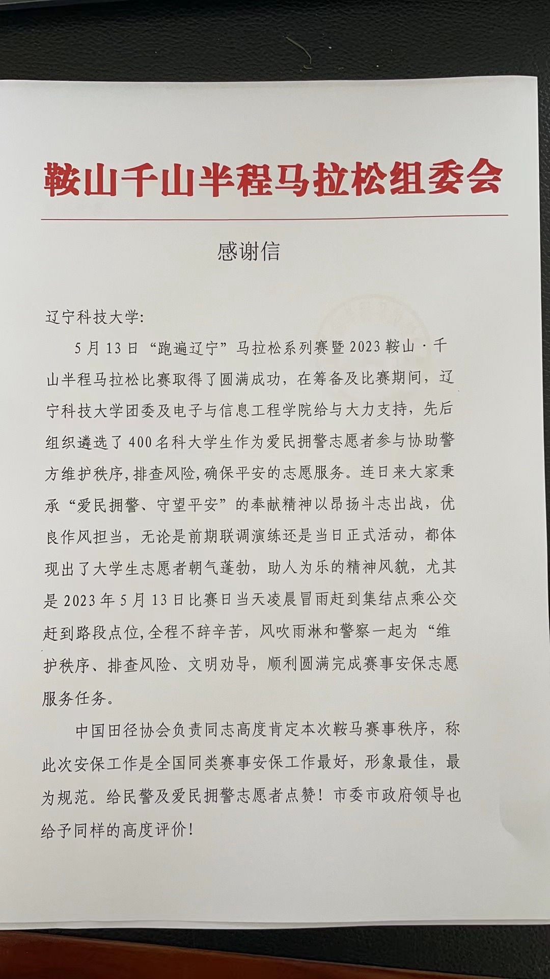 近日,米兰收到来自鞍山千山半程马拉松组委会的一封感谢信,由衷地感谢米兰团委及电子与信息工程学院给予“鞍马”赛事的大力支持,向米兰400余名青年志愿者对此次马拉松做出的卓越贡献致以最真诚的谢意。