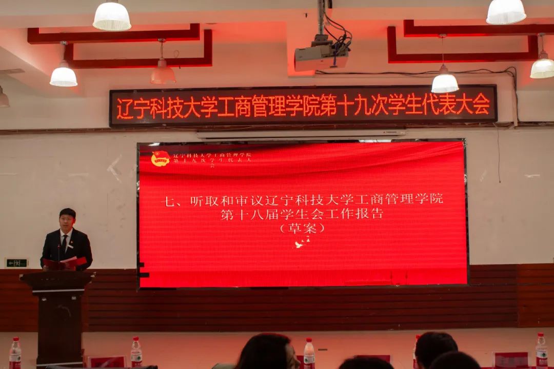 大会还听取和审议了由学生会执行主席张翀赫代表第十八届学生会全体成员作的工作报告。他对学生会工作进行总结与回顾,在过去的一年里,工商管理学院学生会秉持“自我提升、自我奉献、自我质疑、自我鞭策”的原则,全心全意为同学服务,加强组织建设,紧跟时代,勇于创新,发挥先锋模范作用。同时希望新一届学生会成员能够充分发挥桥梁和纽带的作用,积极反映学生意愿,维护学生权益,同时要不断加强自身建设,提高工作水平,为学院的发展做出新的更大贡献。