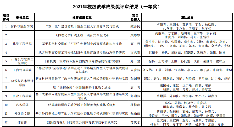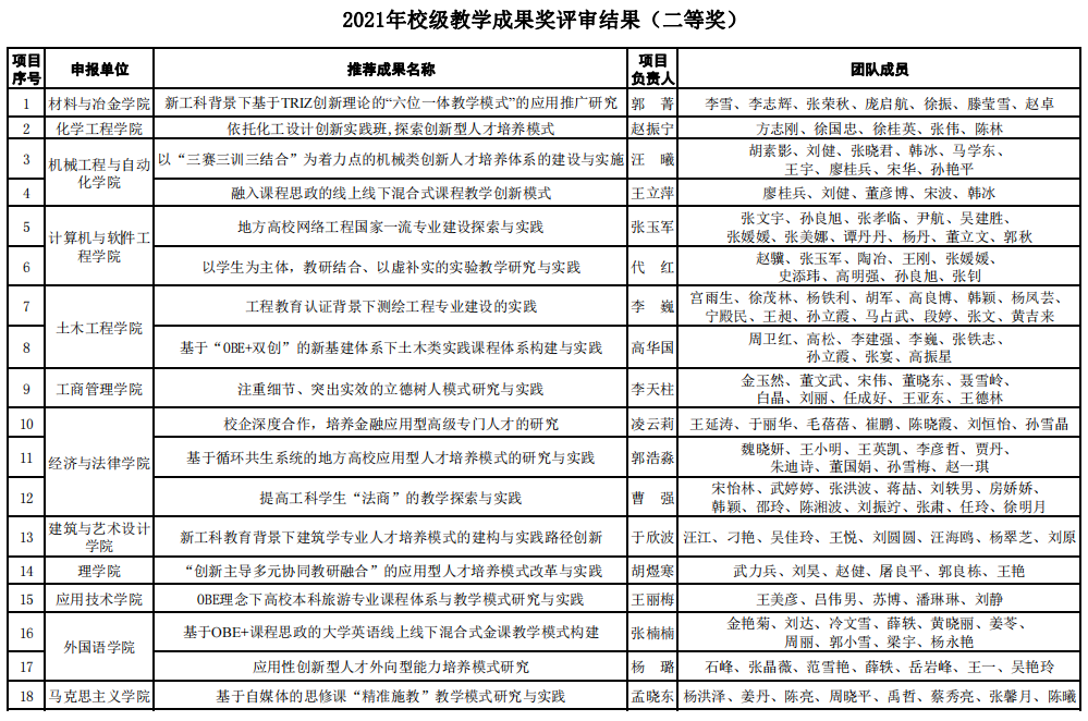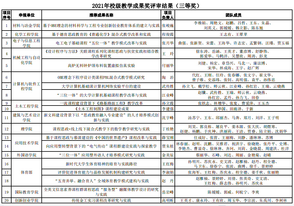 根据《关于开展米兰2021年教学成果奖评选工作的通知》(米兰教发【2021】35号)相关工作安排,各教学单位推荐参评2021年校级教学成果奖共62项。经专家评审,学校研究决定2021年校级教学成果奖获奖项目为50项,其中一等奖12项,二等奖18项,三等奖20项。获奖名单公布如下:
