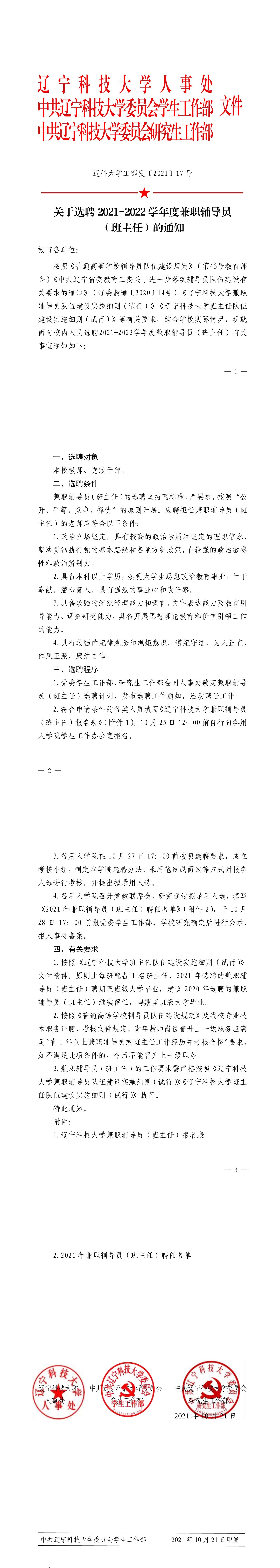 关于选聘2021-2022学年度兼职辅导员(班主任)的通知