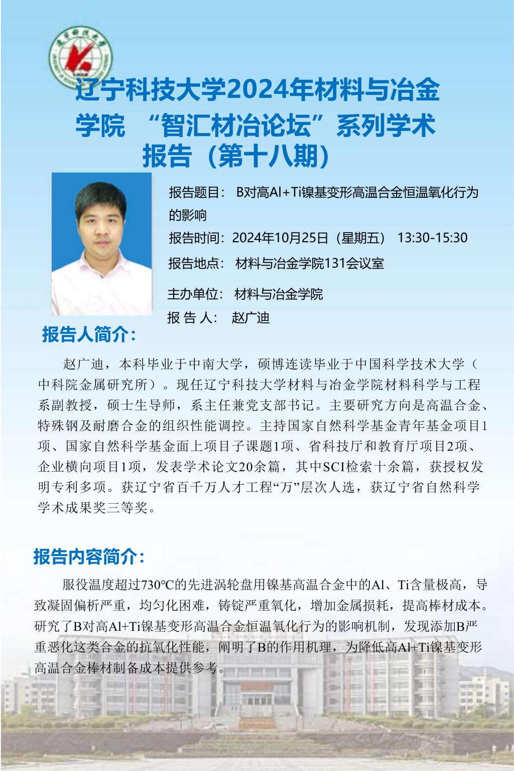 学术预告:B对高Al+Ti镍基变形高温合金恒温氧化行为的影响