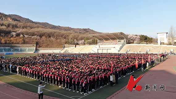6∶30,升旗仪式开始。迎着初升的朝阳,升旗手、护旗手和护旗方队伴着激昂的进行曲,踏着铿锵有力的步伐走向升旗台。国歌响起,鲜艳的五星红旗冉冉升起。全体师生庄严肃立,面向国旗行注目礼,高唱国歌。