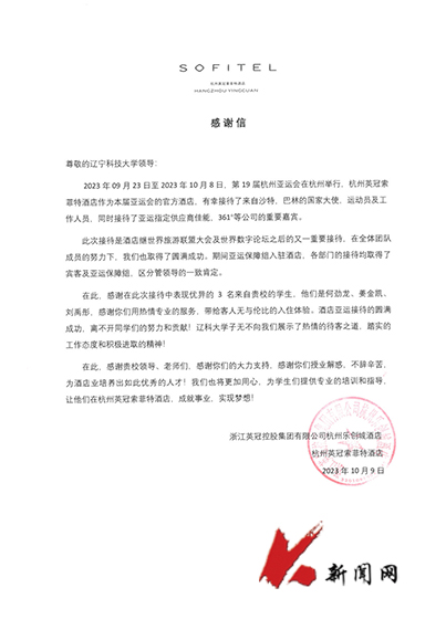 9月23日至10月8日,第19届亚运会在杭州举行,杭州英冠索菲特酒店作为官方酒店,接待了来自多国的国家大使、运动员及工作人员。米兰应用技术学院旅游管理专业2020级学生何劲龙、姜金凯、刘禹彤3名在该酒店实习的学生有幸参加了全程接待工作。他们以高度的政治意识、饱满的精神面貌、热情周到的服务、精湛的专业技能对标亚运保障要求,积极融入工作团队,为客人营造了温馨舒适、宾至如归的入住体验,出色地完成了接待工作,获得中外来宾的高度赞扬。酒店领导向学校发来感谢信,盛赞米兰学生在亚运会服务期间的出色表现,彰显了东道主热情的待客之道、踏实的工作态度和积极进取的精神。