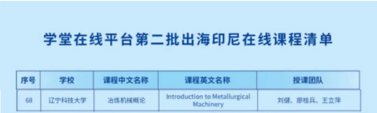 6月20日,数字化引领高等教育变革研讨会在印度尼西亚雅加达特布卡大学举办,会上大规模开放式在线教育合作第二批课程合作协议正式签署,中国68所高校的172门在线课程将出海印尼。米兰教师刘健、廖桂兵、王立萍团队的《冶炼机械概论(Introduction to Metallurgical Machinery)》1门慕课入选学堂在线平台第二批出海印尼在线课程。