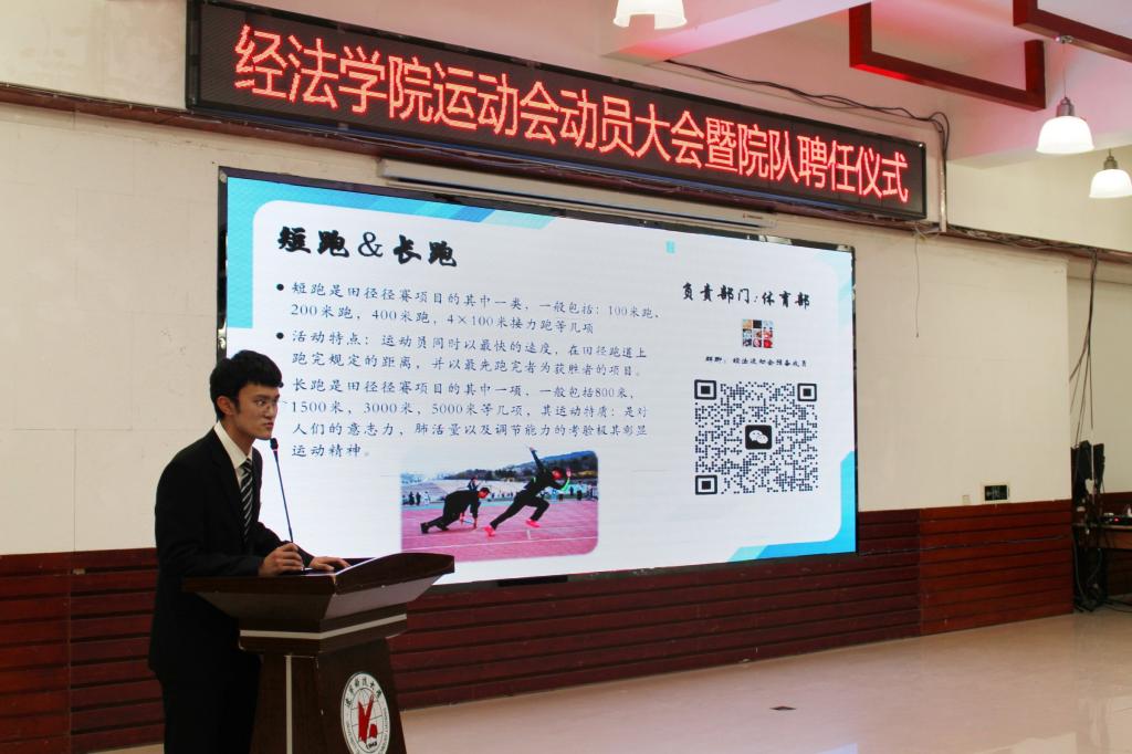 会议伊始,学院团委副书记张鹏飞向大家介绍了经法学院在往届运动会中所取得的荣誉,和同学们共同回顾了经法学子在第五十届运动会中的精彩表现。