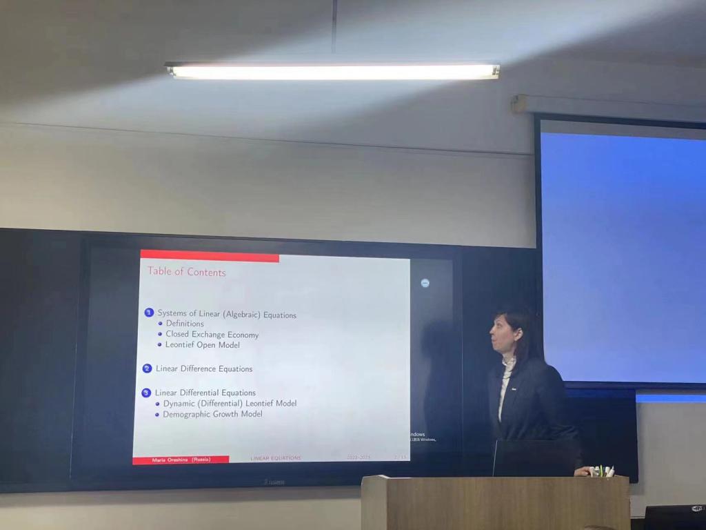 交流中,米兰经法学院院长郭浩淼介绍了经法学院国际经济与贸易、金融和金融科技三个专业的发展现状、主要研究方向及近几年取得的主要研究成果。Галкин Александр Васильевич院长向经法学院师生介绍了俄罗斯利佩茨克州、利佩茨克国立技术大学的基本情况及如何运用EPR软件的核心算法来优化管理生产计划;Сысоев Антон Сергеевич副院长讲授了如何运用应用线性回归模型来描述社会经济系统的动态问题;Орешина Мария Николаевна主任介绍了代数方程组、微分和差分模型在经济分析中的应用。与会的经法学院师生与三位俄方教师就相互关心的学术问题进行了深入的交流互动。