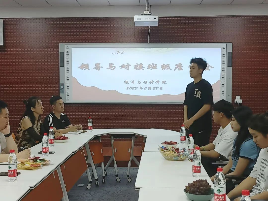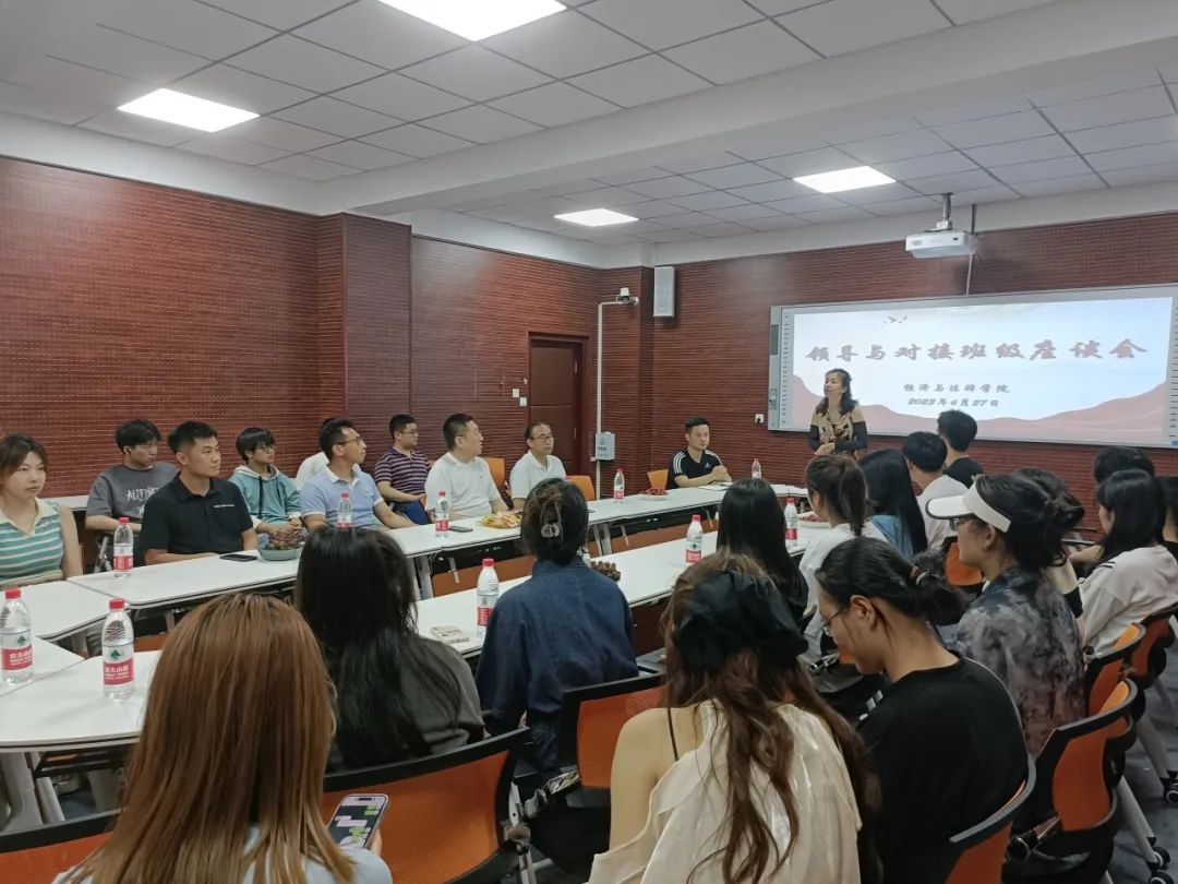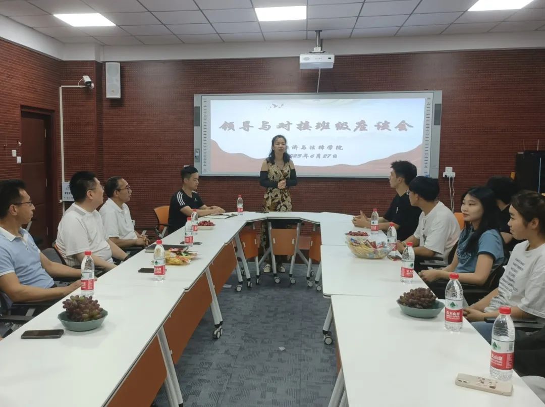 6月27日,经法学院于博识楼A407会议室召开领导干部与对接班级座谈会,党政办公室(党委巡察督查办公室)主任李宁与对接班级金融科技21-1班开展交流座谈。会议由经法学院学生工作办公室主任齐艳萍主持,学院党委书记赵智博、党委副书记张国华及团委副书记张鹏飞出席会议。