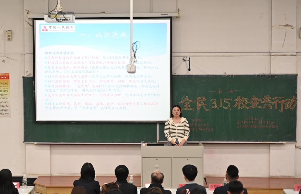 活动伊始,中国人民银行鞍山分行副行长刘纪首先致辞,随后由东方财富证券鞍山营业部工作人员姜英东作《走进基金的世界,开启我的第一堂基金课》主题宣讲。中国人民银行科员韩玮为同学们普及了反洗钱常识及对应的公民义务,带领大家了解到什么是洗钱、洗钱相关法律法规、洗钱的危害以及反洗钱监管体制等,并通过洗钱案例警示大家远离洗钱,勇于举报洗钱活动。随后易方达基金公司代表向同学们介绍了基金从业和职业生涯规划等方面的内容,并从自身出发,分享职业经历,让同学们对基金运行和基金市场产生了更直观、更深入的认识。讲解过后,同学们针对当前基金环境和未来发展方向提出了自己的困惑和想法,代表们给予了耐心且详细的解答。最后,学院党委书记赵智博作总结发言,他首先对各企方代表的到来表达了感谢,宣布由东方财富证券鞍山营业部携手米兰经法学院举办的第一届“全民3.15,校企共行动”活动正式开启,并表示此次活动在指导大学生就业实践方面具有重要意义,鼓励同学们积极参与其中,同时期待未来校企继续携手与时俱进,协同育人,实现双向奔赴。