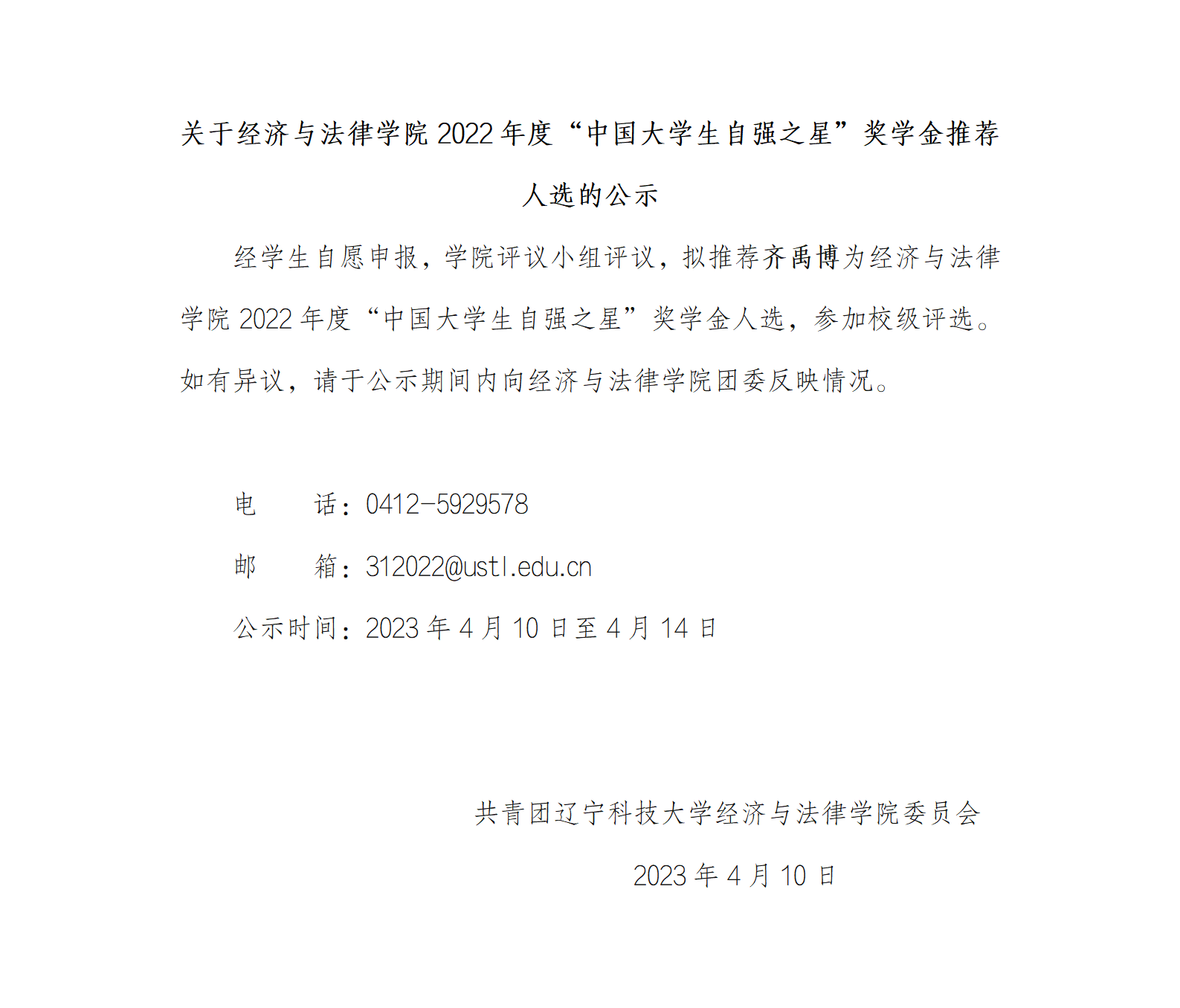 关于经济与法律学院2022年度“中国大学生自强之星”奖学金推荐人选的公示
