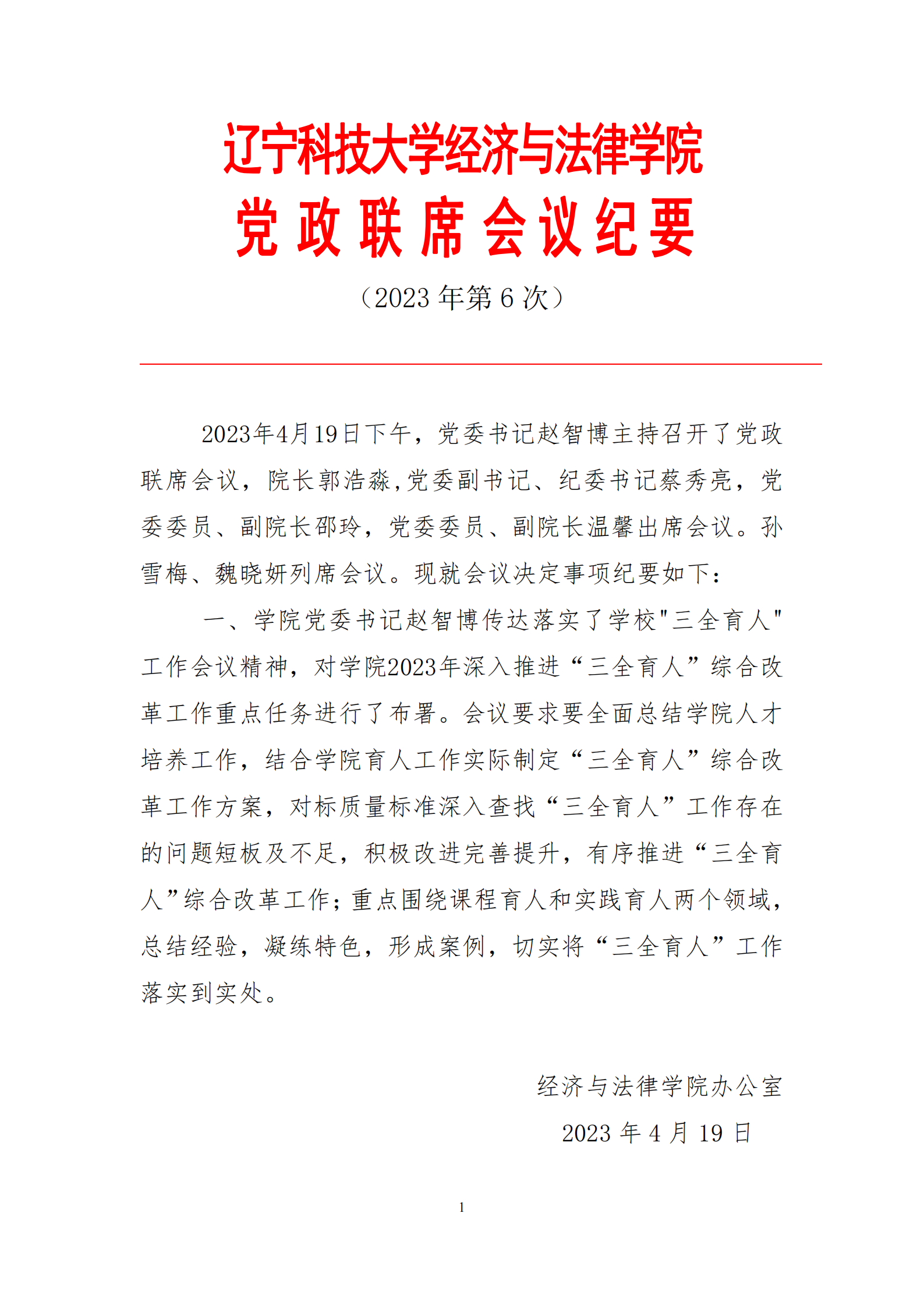 米兰经济与法律学院党政联席会会议纪要(2023年第6次)