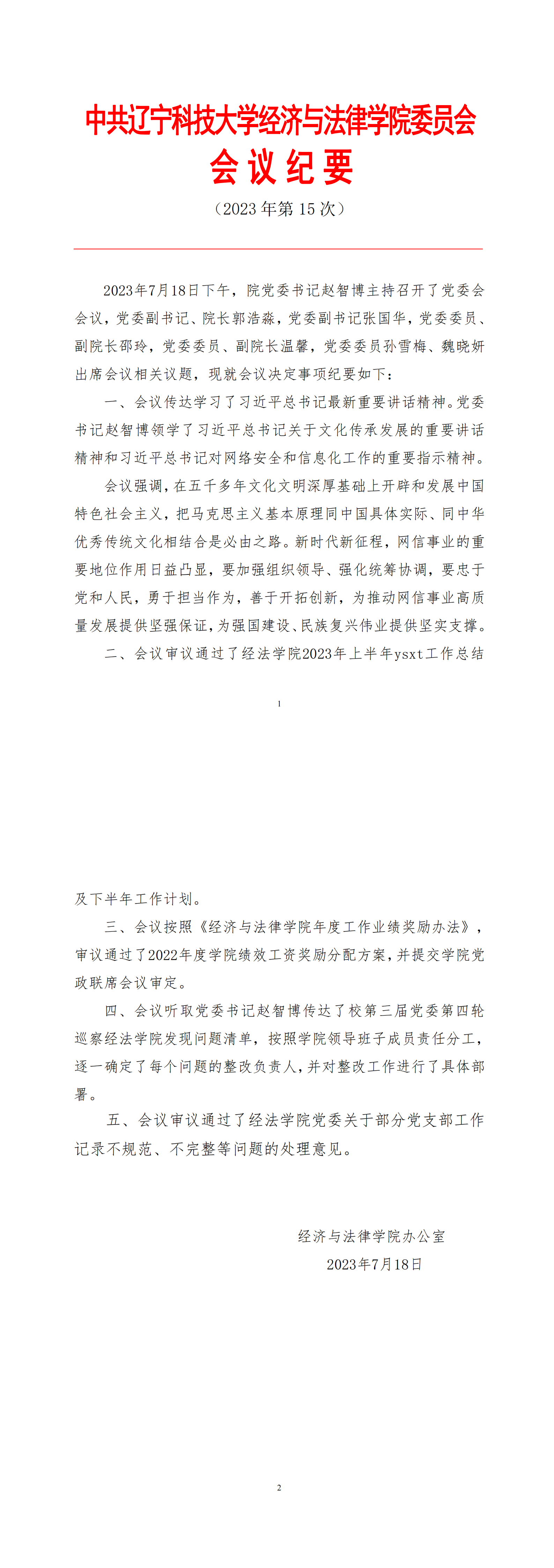 中共米兰经济与法律学院委员会会议纪要(2023年第15次)