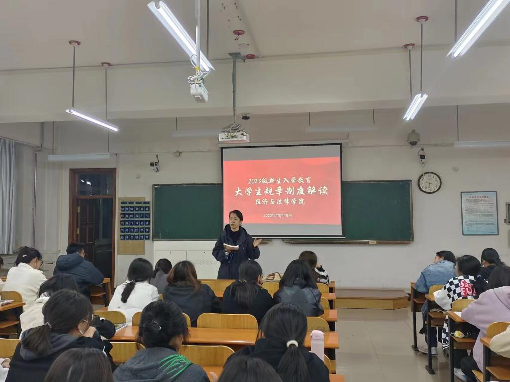 为了让2023级新生充分了解学校规章制度,帮助他们更好地规范自身行为,养成良好习惯,确立学习目标,10月16日,经法学院于博学楼C306、C310分别召开新生入学教育之"大学生规章制度"解读会,主讲人为学办主任齐艳萍,2023级全体新生参加会议。