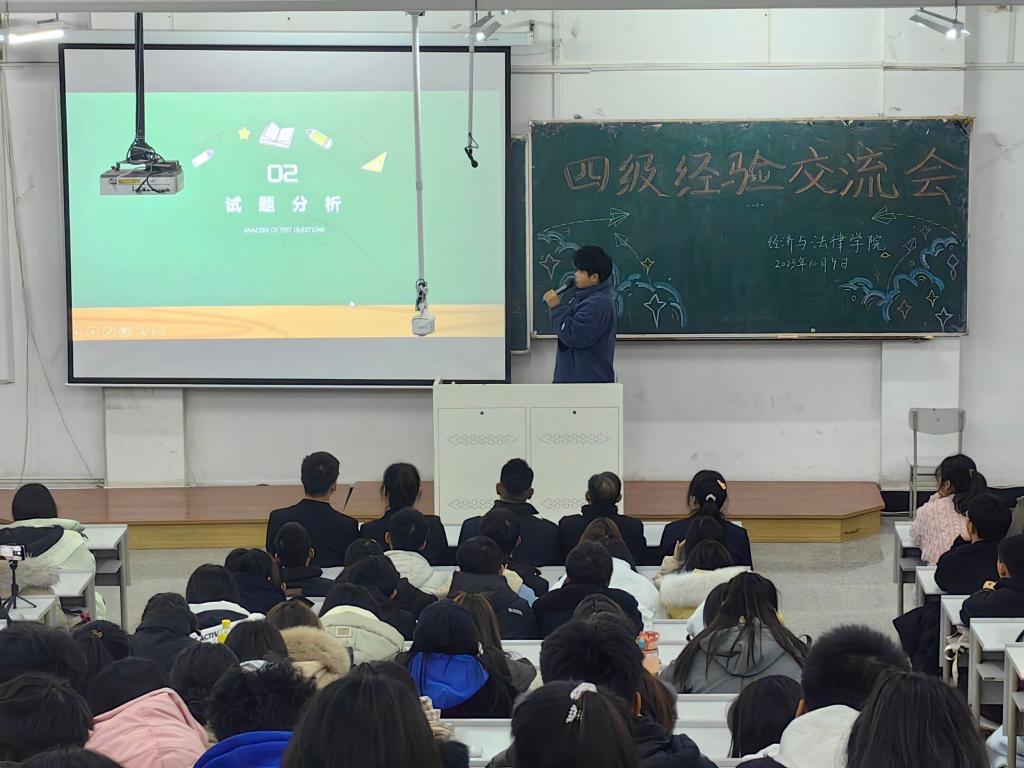 11月9日,经法学院于博学楼C102举办“三比一促一传承”系列活动之英语四级经验交流会。本次会议由学生会学术科技部工作人员刘营萍主持,学院党委书记赵智博、党委副书记张国华、团学骨干以及各年级学生共计280余人参加会议。