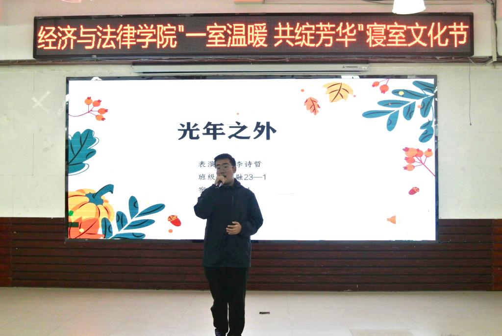 活动中,Vshow舞团开场的精彩表演点燃了观众的热情,现场气氛瞬间升温,活动正式拉开序幕。本次寝室文化节共分为“寝室vlog大赛”“才艺大赛”和“叠被子大赛”三个环节。随着全场热烈的掌声,“寝室vlog大赛”将各参赛寝室成员们精彩纷呈的寝室生活呈现在观众眼前。选手们通过照片、视频、采访等各种各样的形式记录了寝室成员之间的点点滴滴,展现了寝室生活的温馨日常以及各寝室成员们独特的闪光点。“才艺大赛”上,选手们各显神通,给观众带来了一场视听盛宴。小品《勇闯301》以诙谐的剧情、滑稽的动作让现场笑声不断;歌曲《年轮》、诗朗诵《面朝大海,春暖花开》、舞蹈串烧等表演以充沛饱满的情感诠释了经法学子们积极向上、意气飞扬的寝室风采,体现了寝室成员们热情奔放的精神面貌,赢得了在场老师和同学们的阵阵掌声。修明武术协会和金融21班秦煜宁的串场表演以及“抱团游戏”将气氛再次推向高潮,现场欢呼喝彩声不断。“叠被子大赛”环节中,随着主持人一声令下,参赛同学迅速进入状态,即便两位主持人不断提问干扰,选手们依然细致认真地整理被子,现场气氛热烈,欢呼不断。两分钟后,一块块棱角分明的“豆腐块"展现在观众面前,赢得了观众的热烈掌声。由韦敏玲、何运来、周思彤为大家带来的舞蹈串烧,表演精彩绝伦,令人印象深刻。