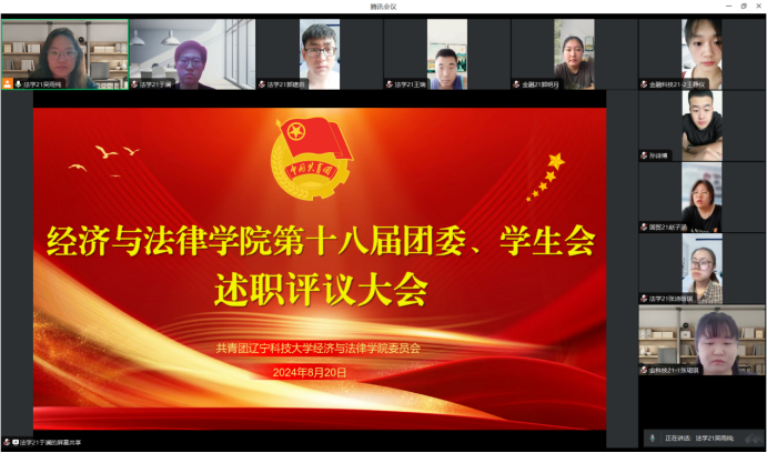8月20日,经法学院于腾讯会议APP召开第十八届团委、学生会述职评议会,会议由学院学生会执行主席兼办公室负责人吴雨纯主持,团委、学生会各部门负责人参加本次会议。