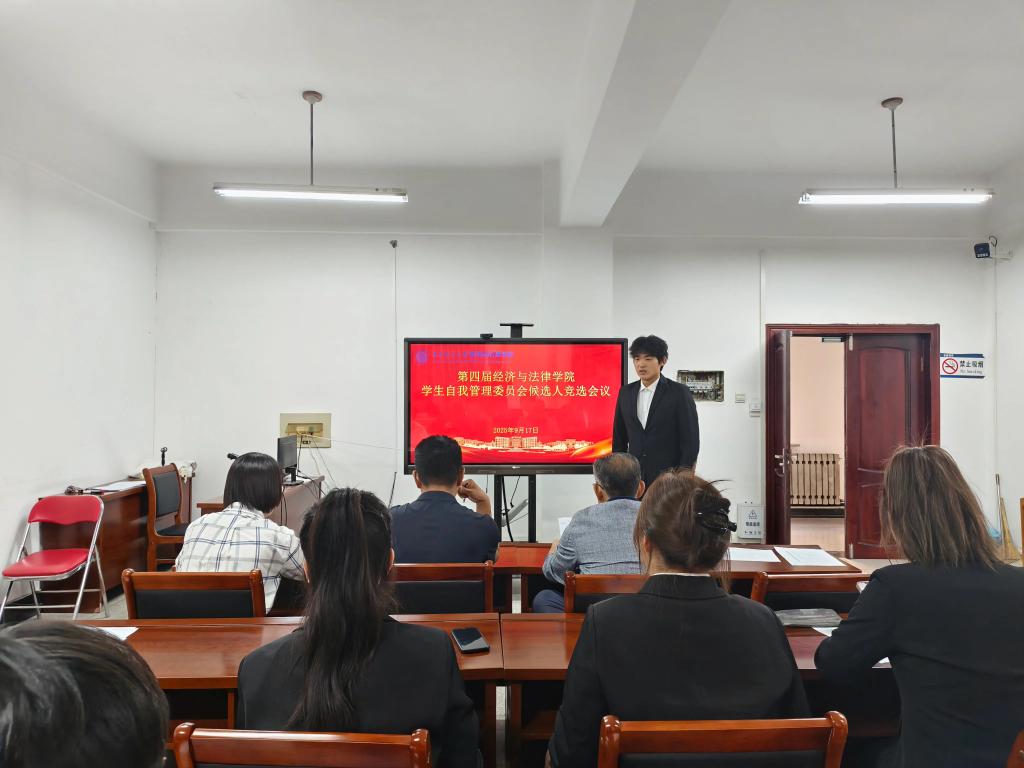 9月17日下午,经法学院于博识楼A313召开经法学院大学生自我管理委员会(以下简称“自管会”)换届竞选会议。会议由经法学院党委副书记张国华主持,学院党委书记赵智博、学办主任李路云以及团委书记张鹏飞出席会议,共有24名同学参与竞选。