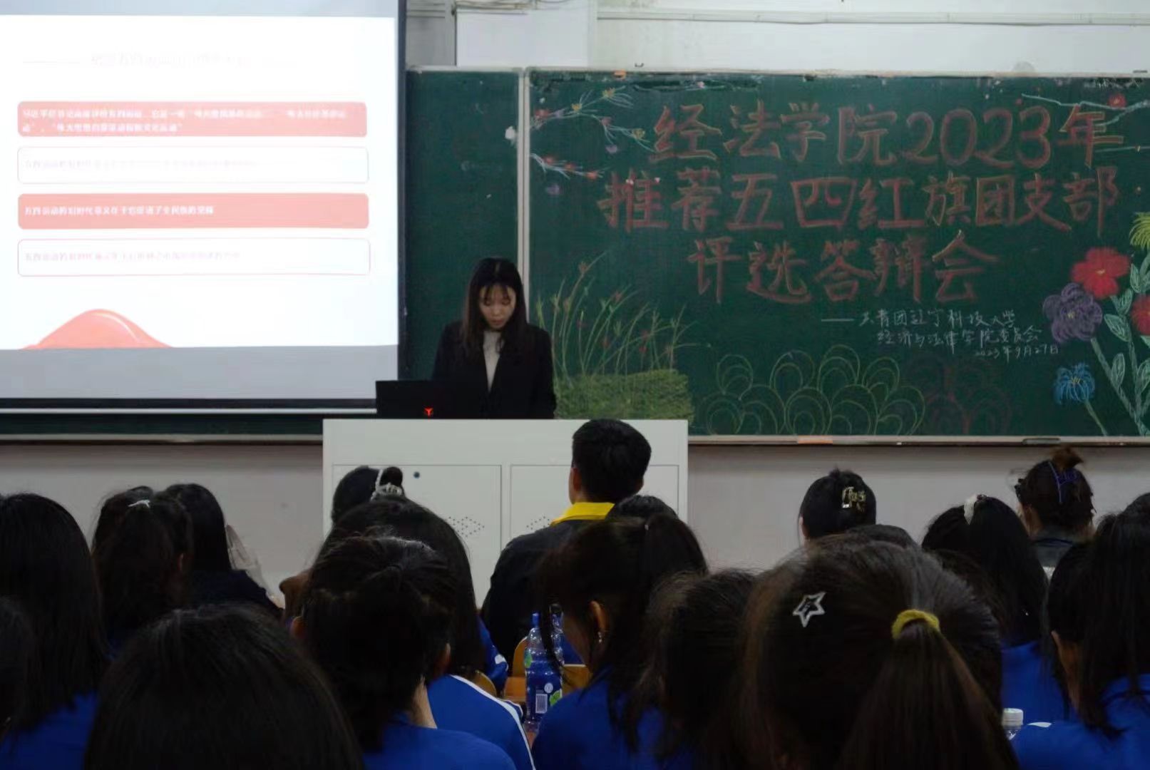 9月27日,经法学院于博学楼C112举办“五四红旗团支部”评选答辩会。本次答辩会由分团委工作人员赵子涵主持,学院团委副书记张鹏飞、分团委副书记王菀舒、院学生会主席团成员韩杬希、刘爱琳,生活权益部负责人王鑫、分团委组织与宣传部门成员以及21级、22级各团支部书记担任答辩评委。