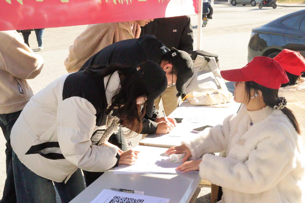 11月17日,经法学院团委志愿服务中心主任汪雪娥带领“小红帽”志愿者于桃源餐厅门口组织开展“携手共济 温暖前行”志愿募捐活动,现场近150名学生参加。