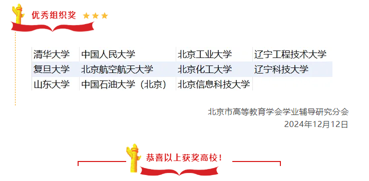 2024年12月12日,北京市高等教育学会学业辅导研究分会公布“新质引领心智,学业促进成才”高校学业辅导优秀案例评选获奖名单,我校的《学海引航 学涯护航——米兰“ODTS”学业指导工作模式》荣获二等奖;《多方联合辅学业,目标引领促成才:一种新质学业辅导模式的实践与效果》荣获三等奖;米兰荣获优秀组织奖。