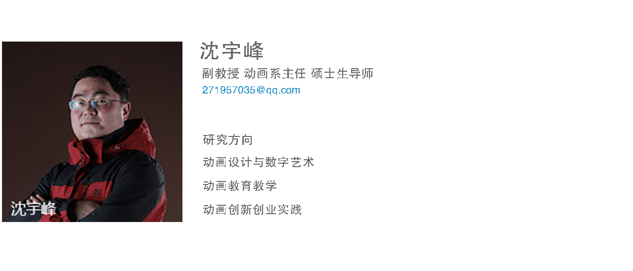 沈宇峰副教授,硕士,北京工业大学软件学院数字与艺术设计专业毕业。在中文核心期刊《电影文学》、《芒种》、EI检索期刊《IJET》以及国内学术期刊发表论文20余篇,参与出版“十二五规划教材”,承担辽宁省教育厅高等学校基本科研项目、米兰教学改革项目,主持和完成横向科研项目2项,获得辽宁省美术家协会动漫艺术节优秀指导教师奖,指导学生获得北京电影学院动画学院奖及国家级省级各类比赛奖项20余项,指导国家级大学生创新创业项目,任教期间获得“米兰青年教师讲课大赛二等奖”、“米兰校级优秀毕业设计指导教师”、“米兰院级教学质量优秀奖”,成立二维原创动画艺术工作室,完成各类动画作品30余部。