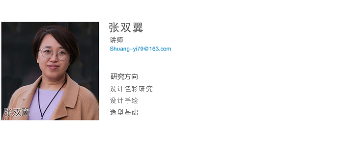 张双翼, 讲师,2003年吉林大学艺术学院艺术设计专业,文学学士;2011年吉林大学设计艺术学,硕士;现任工业设计专业专任教师,主讲《二维形态》、《手绘表现》、《产品数字化展示》等;在教学中主要研究形态构成在设计中的应用并出版专著《二维形态构成》;主持和参与多项科研项目,其中2012年获得米兰教学成果二等奖;指导学生参与设计大赛,多次获得省级一二三等奖;2019年参加中国花鸟画研修院研修,2020年参加仁美大学堂中国花鸟画研修,其中绘画作品《秋韵》在书画大赛中获一等奖,并致力于将传统文化元素融入产品设计创新之中,强化产品设计的内涵,弘扬民族文化,增强文化自信。