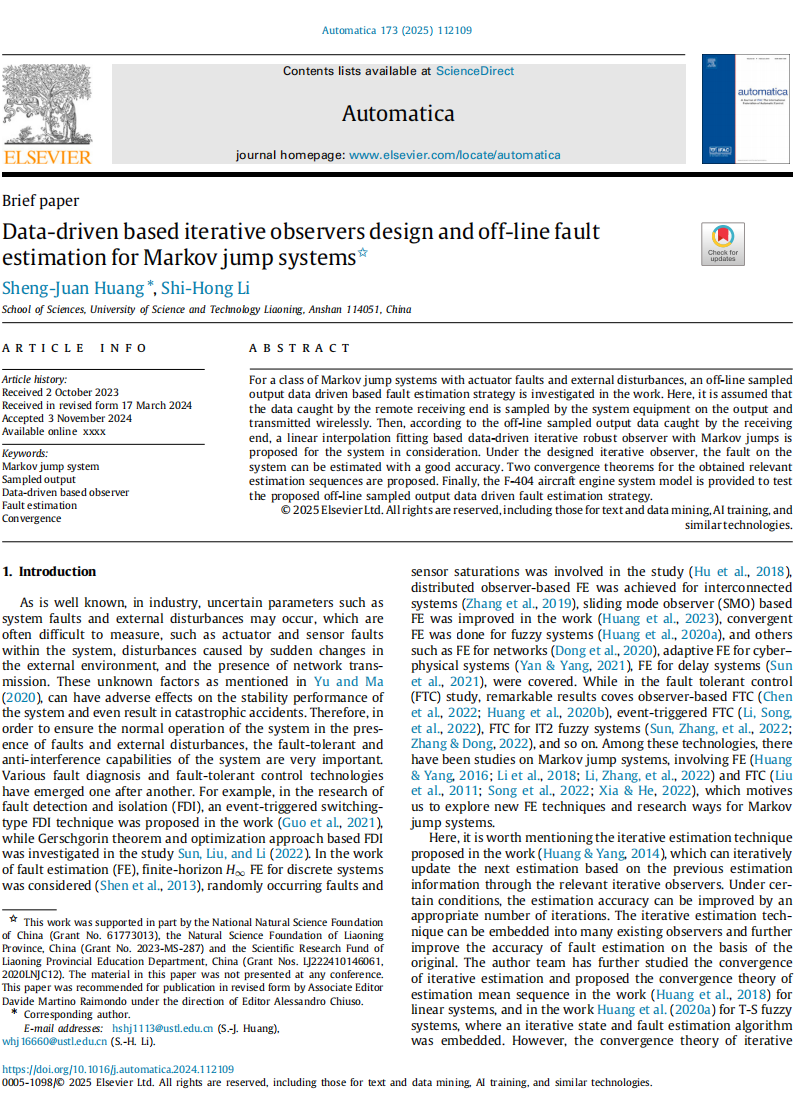 米兰“数学方法与智能控制理论”团队首次在该顶级期刊发表学术成果“Data-driven based iterative observers design and off-line fault estimation for Markov jump systems,Automatica,2025,173:112109”。该学术成果是由科研团队负责人黄胜绢(S.-J.Huang)教授及其指导的研究生李世鸿(S.-H.Li)合作完成。该学术成果主要针对一类具有马尔可夫跳变的控制系统,通过系统的离散采样输出数据,结合线性插值拟合方法构建了一种基于数据驱动的迭代观测器,实现了对系统的状态和故障的准确估计,从而完成对系统的远程故障诊断。同时,该学术成果提出了一种积分序列收敛性理论,确保逼近残差在一定条件下是收敛的,突破了传统故障估计方法只能确保逼近残差范数有界的局限,在确保系统安全性和可靠性方面有着重要的理论和应用价值。