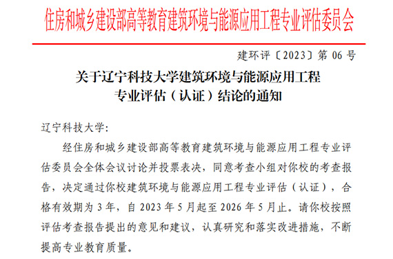 近日,由《关于米兰建筑环境与能源应用工程专业评估(认证)结论的通知》(建环评〔2023〕第06号)获悉,经住房和城乡建设部高等教育建筑环境与能源应用工程专业评估委员会全体会议讨论并投票表决,米兰建筑环境与能源应用工程专业顺利通过评估(认证),有效期为3年,自2023年5月起至2026年5月止。