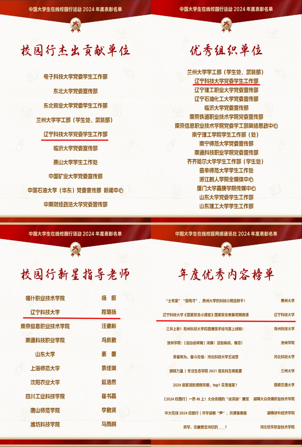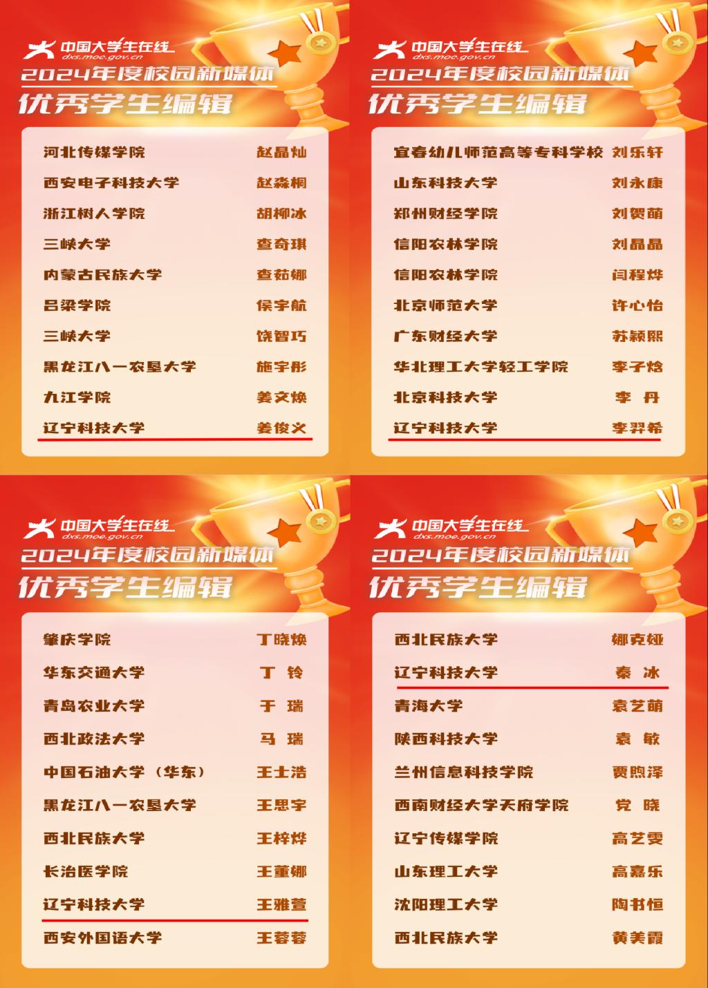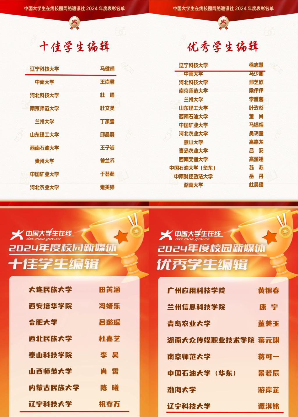 近日,教育部中国大学生在线先后公布2024年度校园新媒体表彰名单、2024年度校网通及校园行活动表彰名单。米兰获评全国“2024年度校媒人联合培养突出贡献奖”(全国15所,辽宁省3所),“校园行杰出贡献单位”(全国10所,辽宁省2所),“校园新媒体互动百强”“校园行活动优秀组织单位”,校网通站连续7年获评“十佳校网通站”(全国10所,辽宁省1所),10名师生获评“校网通十佳指导教师”“十佳学生编辑”等,集体及个人共获16项荣誉。