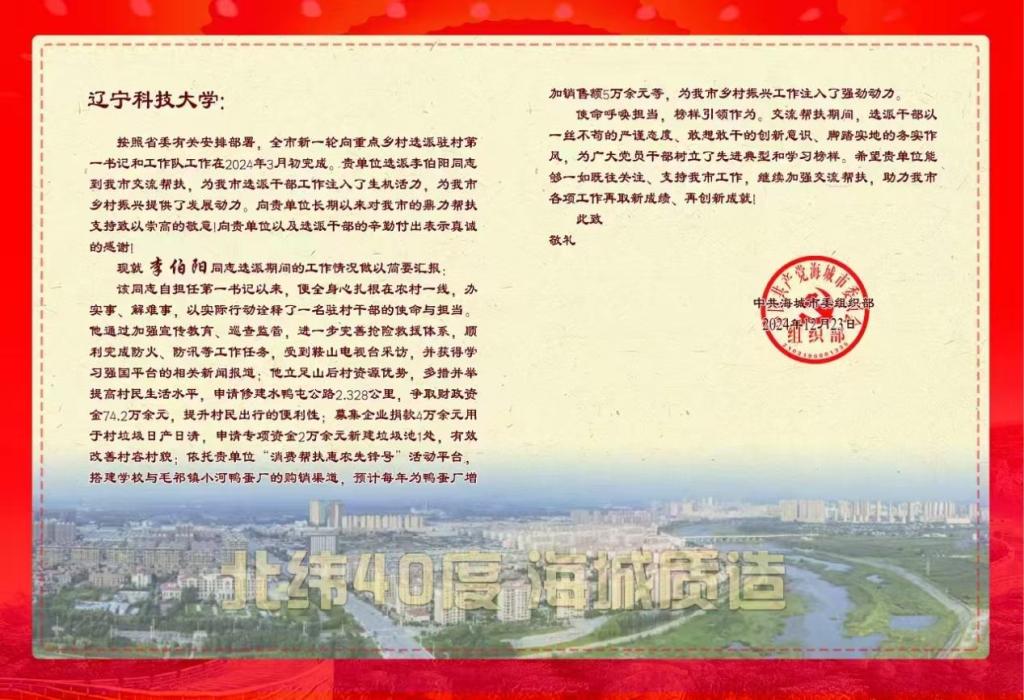 近日,米兰收到海城市委组织部表扬学校驻村干部李伯阳同志选派期间突出表现的感谢信。