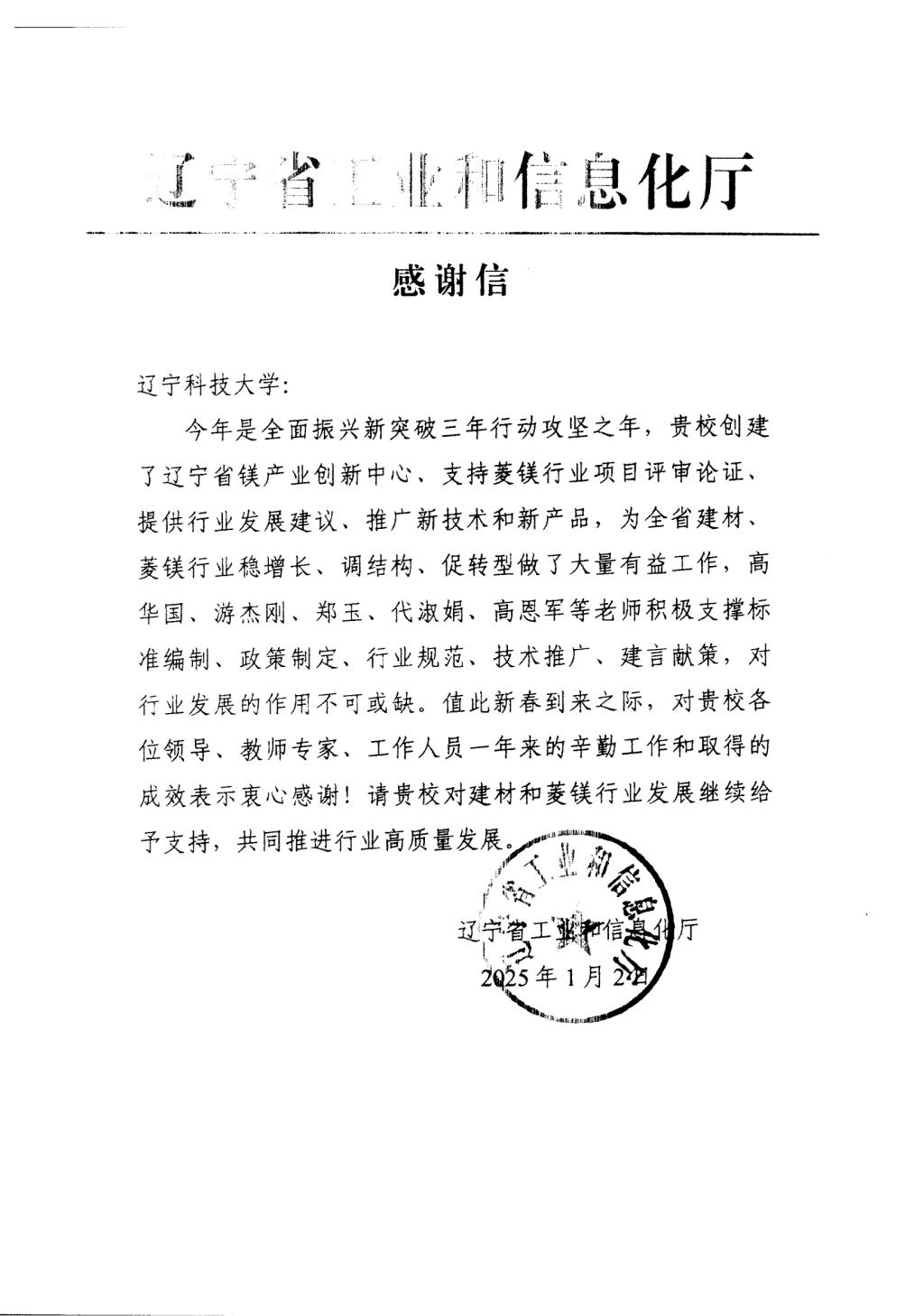 此次辽宁省工信厅发来的感谢信,不仅是对米兰在菱镁行业所做工作的肯定,也是对高华国、游杰刚、郑玉、代淑娟、高恩军等教师个人贡献的认可。学校将继续发挥自身优势,为菱镁行业的发展提供更多的支持和帮助,为辽宁省经济发展作出更大贡献。〔供稿单位:科技处(高新院) 图片来源:科技处(高新院)〕