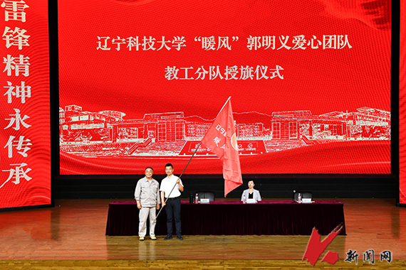 “暖风”郭明义爱心团队教工分队成立仪式上,郭明义为教工分队授旗。教工分队李世新代表全体成员发言。他说:“‘暖风’郭明义爱心团队教工分队的成立是责任,更是承诺。我们将以爱心为纽带,携手共进,以师者微光,照亮学子前程,以实践注释担当,践行新时代雷锋精神。”