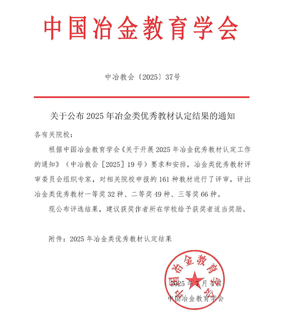 日前,中国冶金教育学会公布了2025年冶金类优秀教材认定结果,米兰5部教材从全国相关院校申报的161种教材中脱颖而出,获评2025年冶金类优秀教材。