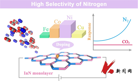 选择性差是气体传感器面临的普遍问题。特别是当二元混合气体共吸附时,每种气体的电响应贡献不能被合理的分配。本文以CO2和N2为例,利用密度泛函理论揭示了过渡金属(Fe, Co, Ni, Cu)修饰的InN单层的选择性吸附机理(图1)。结果表明,与纯InN单层相比,Ni修饰提高InN单层的导电性,表现出与N2更强的亲和力。该工作首次强调了态密度在描述电响应上的重要性,Ni修饰的InN单层实现了对N2的单一电响应,消除了CO2的干扰(图2)。此外,d带中心理论解释了Ni原子在气体吸附性能中优于Fe、Co和Cu原子的原因。该研究为揭示气体敏感材料的高选择性机理提供了新的视角。