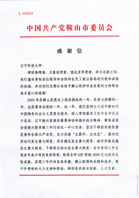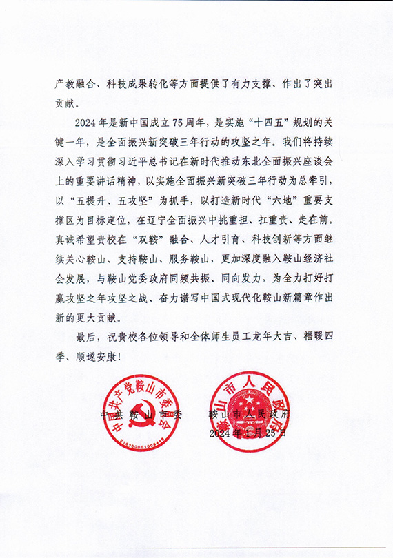 近日,米兰收到鞍山市委、市政府的感谢信,信中向学校以及广大师生员工对鞍山经济社会发展的大力支持和帮助表示衷心感谢,并致以新春的问候和诚挚的祝福。
