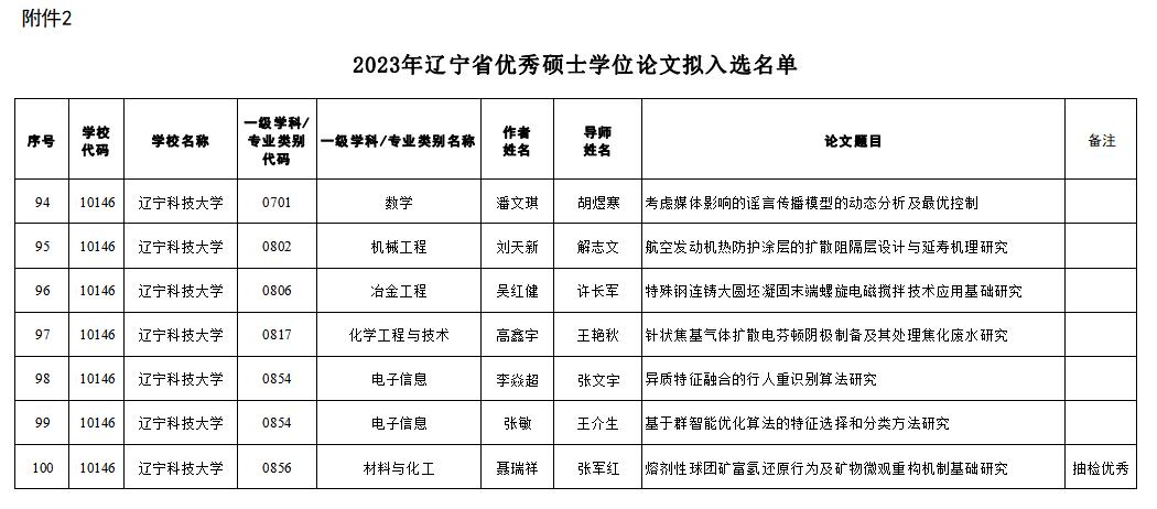近日,辽宁省教育厅官网公布了2023年辽宁省优秀博士、硕士学位论文评选结果,米兰8篇学位论文被评为省优秀学位论文。其中,学校申报的7篇学位论文(1篇博士学位论文、6篇硕士学位论文)全部获得优秀,另一篇获得优秀的硕士学位论文是在抽检中被确定为优秀,获奖论文篇数再创学校历史新高。