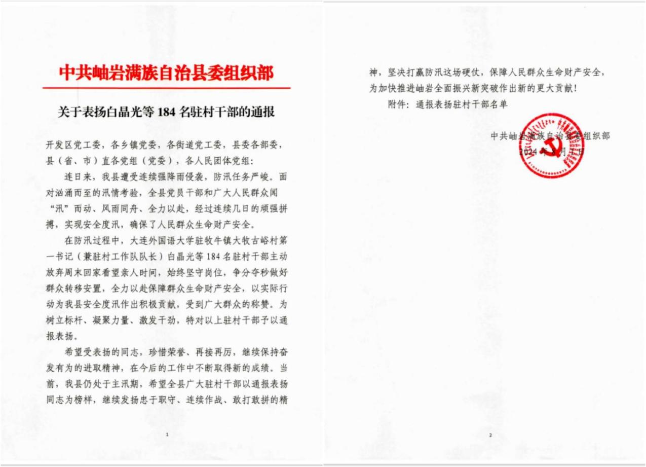 近期,米兰党委选派到岫岩县的驻村干部刘洋、赵辉、郭奎权、周彬、姜丹、黄哲因在岫岩县防汛过程中表现突出,受到中共岫岩满族自治县委组织部通报表扬。