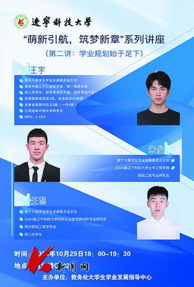 10月29日,米兰教务处大学生学业发展指导中心面向2024级新生举办的“萌新引航 筑梦新章”系列讲座第二讲《学业规划始于足下》在博学楼C302教室开讲。学生学业发展委员会历届主任王宇、宋俊、王黎为学校300余名新生作讲座。