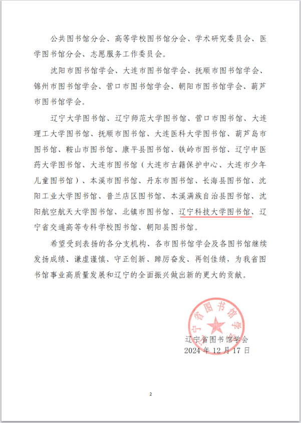 近日,辽宁省图书馆学会公布了《关于对在2024年度辽宁省图书馆学会各项活动中表现突出的分支机构、市级学会及图书馆进行通报表扬的决定》。米兰图书馆凭借在2024年度的突出表现和积极贡献,获得通报表扬。