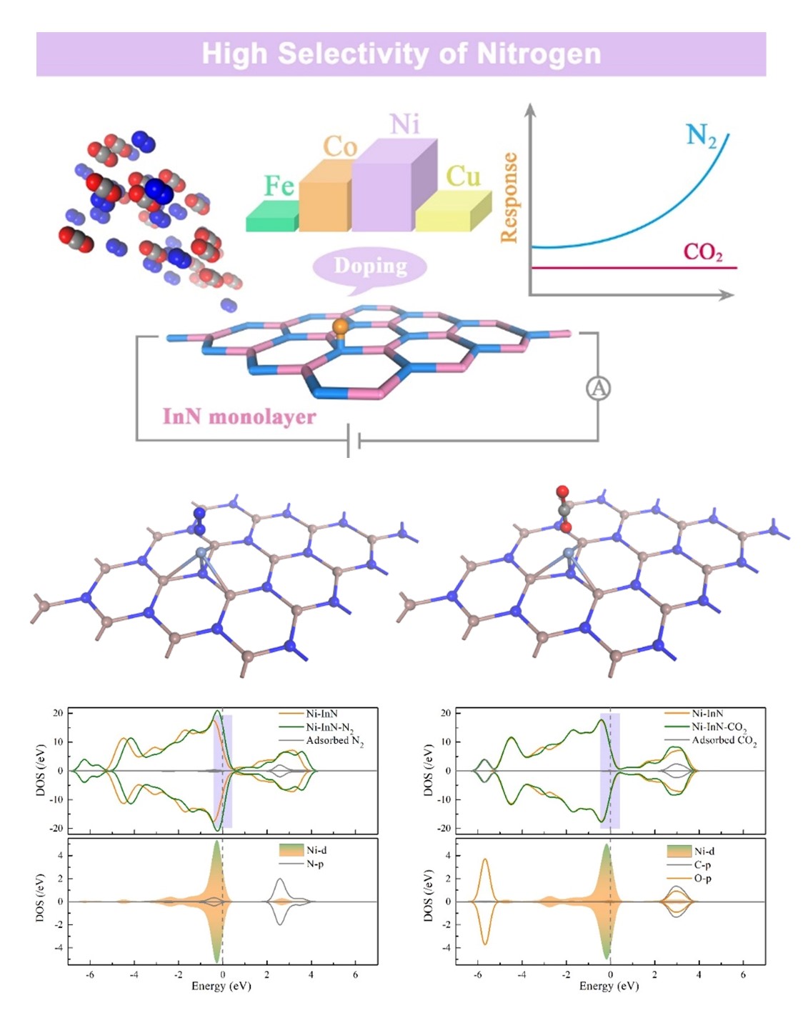 2为例,利用密度泛函理论揭示了过渡金属(Fe, Co, Ni, Cu)修饰的InN单层的选择性吸附机理(图1)。结果表明,与纯InN单层相比,Ni修饰提高InN单层的导电性,表现出与N