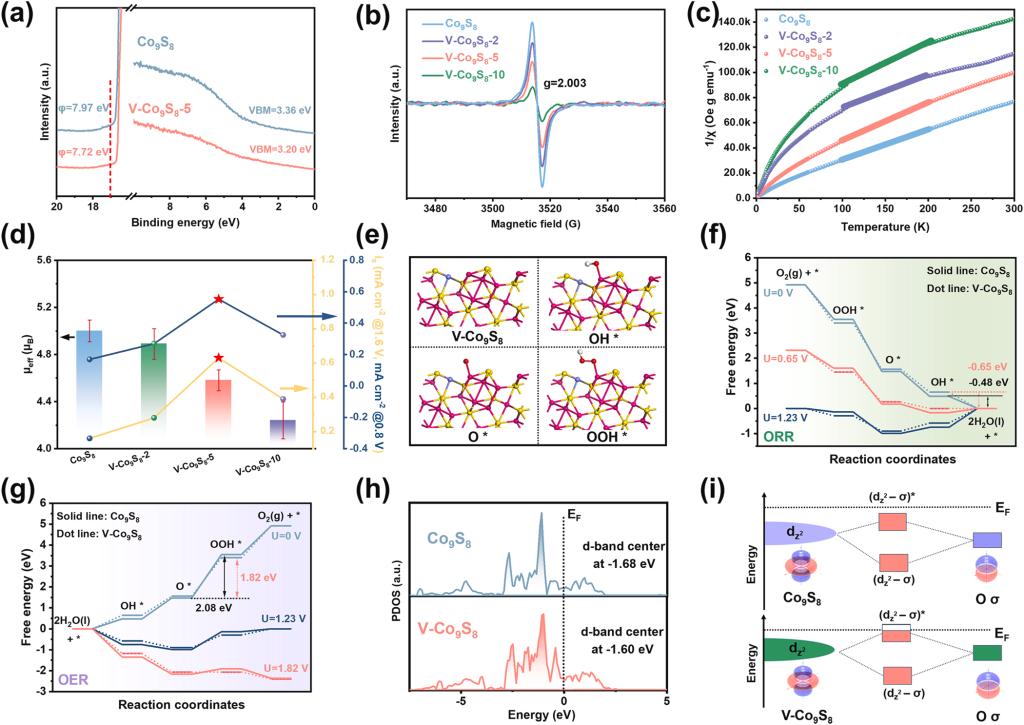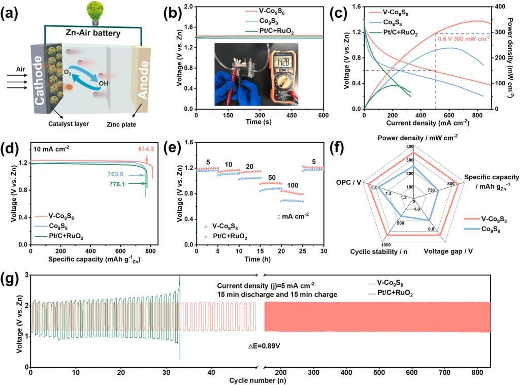 氧反应是质子膜燃料电池、金属-空气电池和水电解中的动力学控制步骤,而高性能氧反应催化剂则成为发展上述系统的关键技术之一。金属-空气电池需要催化剂具有氧还原(ORR)和氧析出(OER)双重功能,而如何实现这种双功能的优化和平衡更具有挑战性。近期,安百钢教授团队通过一种创新双溶剂方法制备钒掺杂的V-Co 9S 8催化剂。该方法可以实现在Co 9S 8纳米粒子晶格中原子水平的钒掺杂,从而调控催化剂电子构型(图1)。研究发现,适量的钒掺杂水平,即对催化剂电子结构的温和调控能够优化Co的自旋态,平衡反应过程中氧中间体的吸附/解吸,从而加速氧反应动力学(图2)。实验研究证实,使用V-Co9S8作为空气阴极催化剂组装的锌-空气电池可提供超高功率密度(345 mW cm -2)、能量密度(814 mAh g Zn -1)和在5 mA cm -2下循环840次的非凡稳定性(图3)。