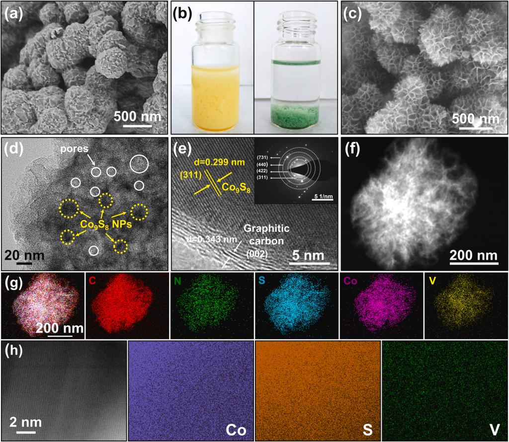 图1. 双溶剂法制备V-Co9S8催化剂微观形貌、结构和元素分布图
