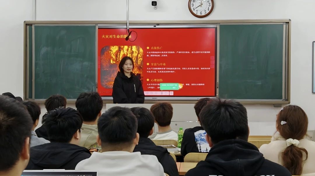 "安全无小事,防患于未然。"宣讲员陈瑶通过真实案例,生动讲解了校园火灾的危害性。她特别提醒同学们注意用电安全,严禁使用违规电器,并播放了灭火器使用方法的视频,帮助同学们掌握必备的消防安全技能。