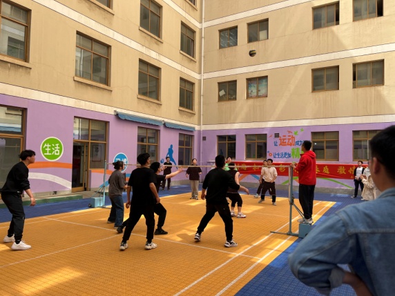 中午12点30分比赛准时开始。一声哨响之后,展开了精彩的比拼。队员们各施绝技,发球、起跳、拦网、扣球,每一次精彩的传球与得分都引来欢呼阵阵。比赛场上,队员们个个精神抖擞,配合默契,气氛文明热烈。此外,各组自发组成的拉拉队给予了队员们极大的鼓励,队员们在赛场上挥洒汗水、奋力拼搏,每一次传球都凝聚着智慧与团结,每一次接球都尽显他们的青春活力。